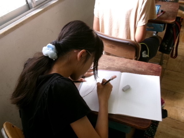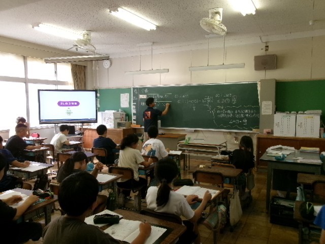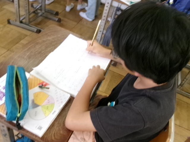 算数です。「分数」の学習です。わり算の商の表し方を考えています。「1÷4」や「5÷2」などは分数を使って表すことを学んでいます。
