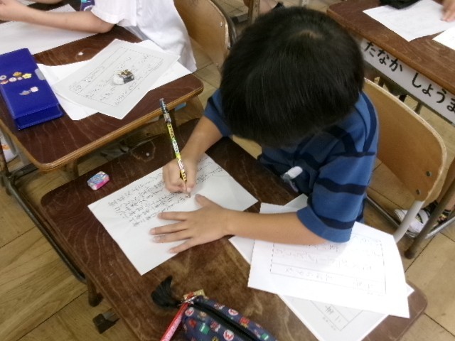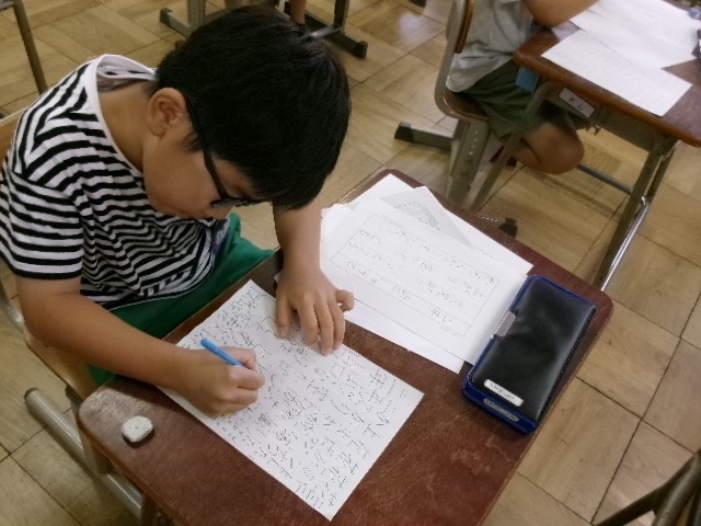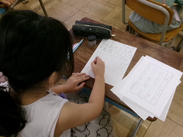 書写です。尾教研書写コンクールの応募作品を練習しています。清書をする前の反復練習です。きれいな字が書けるように何度も何度も練習しています。