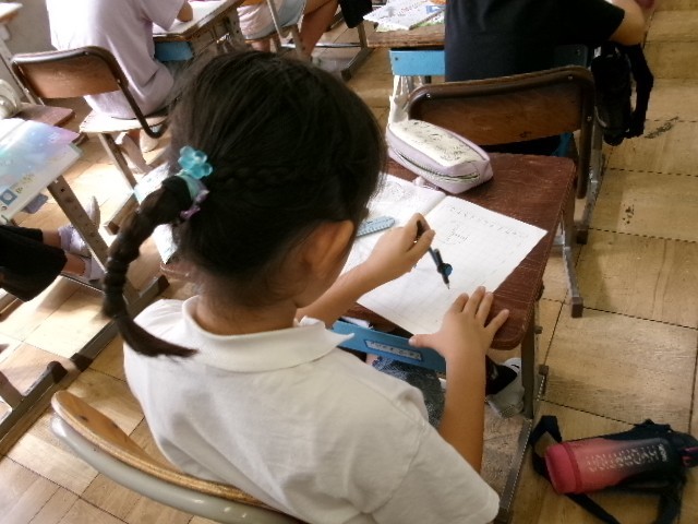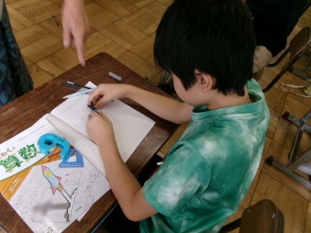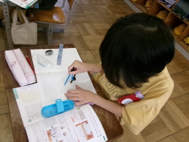 算数です。「円と球」の学習です。コンパスを使って円を描き、直径や半径との関係を調べています。初めて使うコンパスに少し戸惑っているようです。