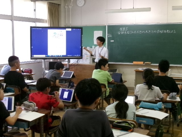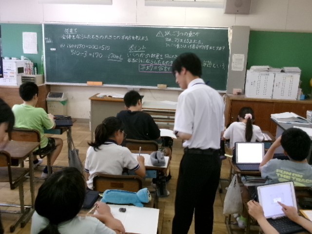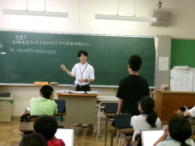 算数です。「平均とその利用」の学習です。教育実習生の先生がいよいよ授業を行います。子どもたちのためにいい授業をしようという熱意が伝わってきます。