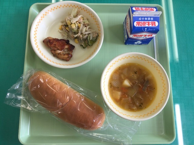 ミルクロールパン・牛乳・鶏肉のハーブ焼き・ごぼうサラダ・ミネストローネ