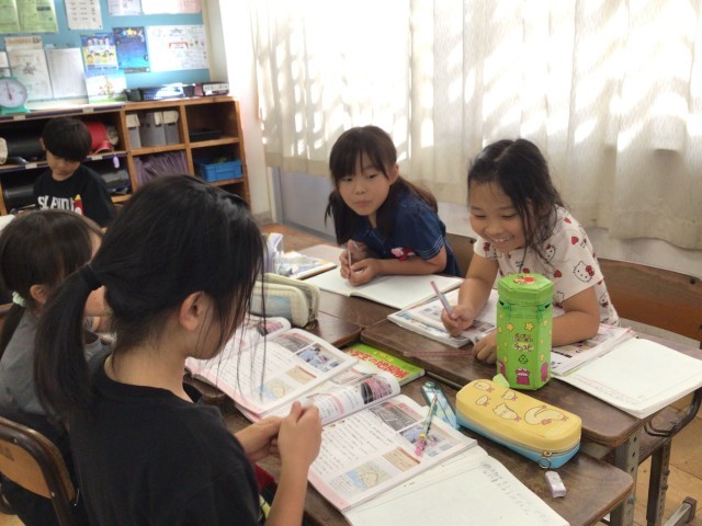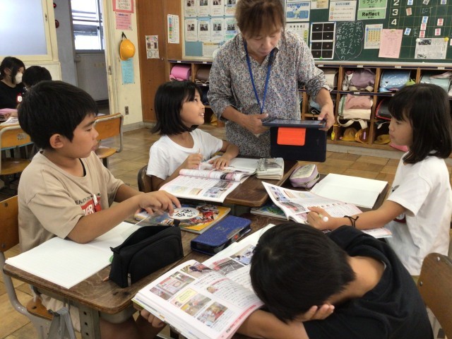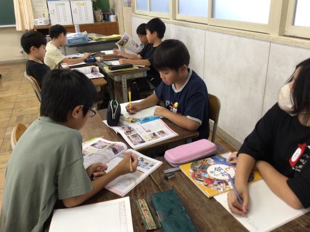 お店で働く人々の様子について学習しています。今日は、品物を売る以外のお店の工夫をグループごとに見つけていました。