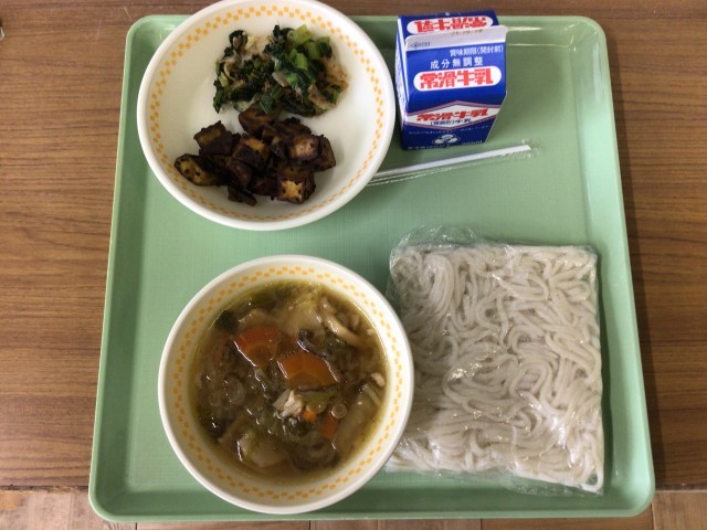 ソフト麺・牛乳・和風かけ汁・大学いも・野菜のおかか和え