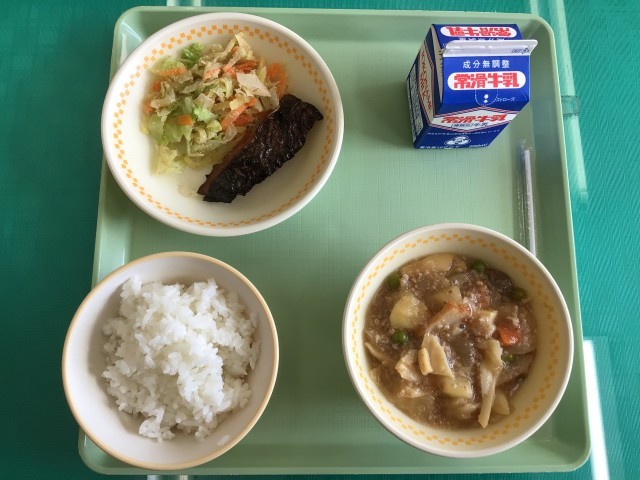 ご飯・牛乳・ブリ三河みりん焼き・ジャガイモのそぼろ煮・野菜とたくあんのごま和え