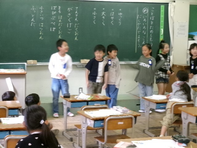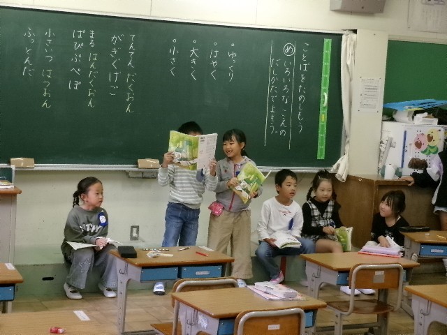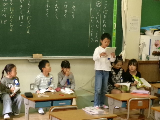 国語です。「ことばを たのしもう」の学習です。早口言葉に挑戦して、うまく言えるかみんなで発表し合っています。まさに、言葉を楽しんでいます。