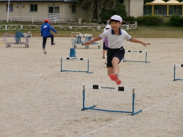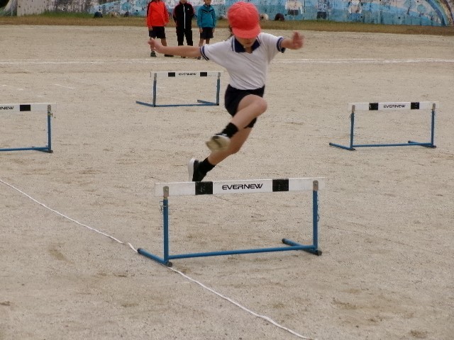 体育です。「走・跳の運動(小型ハードル走)」の学習です。違う間隔で並べたハードルを順番に跳び越えながら、距離感をつかんでいます。タブレット端末で撮影してフォームの確認もします。