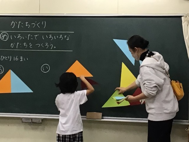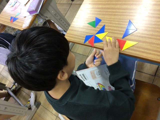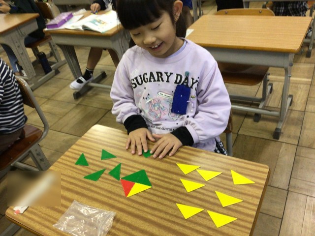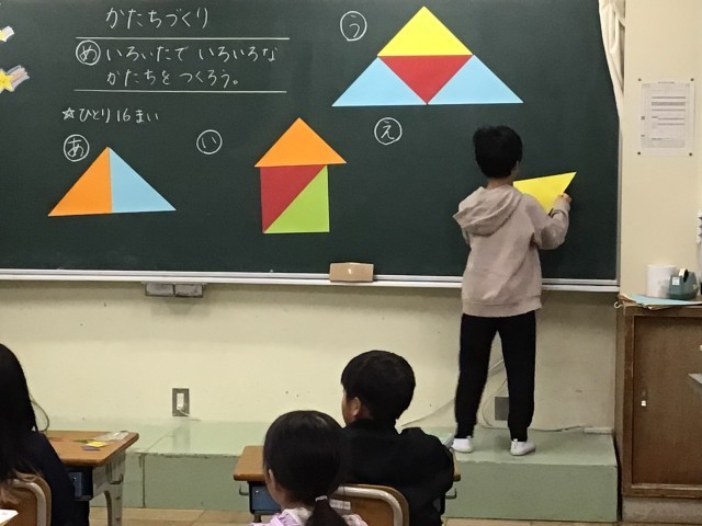 「かたちづくり」の学習に入りました。三角形を使って、家や、ヨットの形を作りました。三角形を回転させて形ができると驚いている児童もいました。