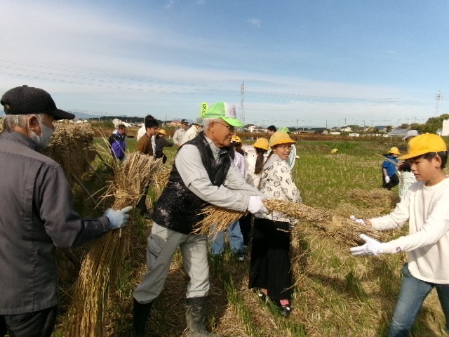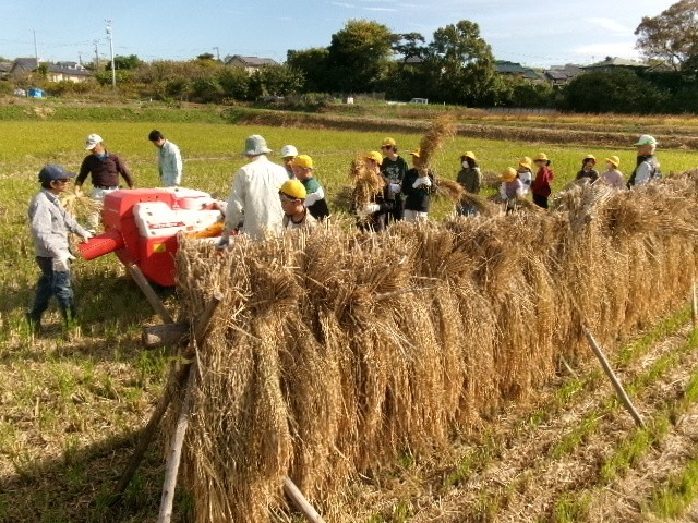 5年生が「南粕谷の美しい自然を守る会」の皆さんのご協力を得て、「脱穀体験」をしました。籾まき、田植え、稲刈りを経て収穫の喜びを味わうことができました。