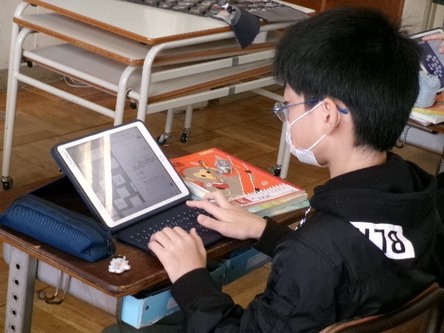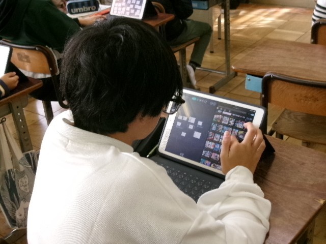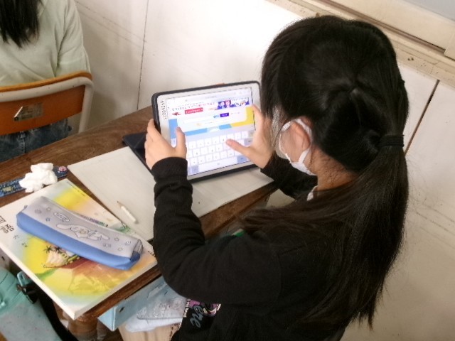 国語です。「筆者の工夫をとらえて読み、それをいかして書こう(発見、日本文化のみりょく)」の学習です。日本文化について調べ、その魅力を伝えるために資料を検索しています。