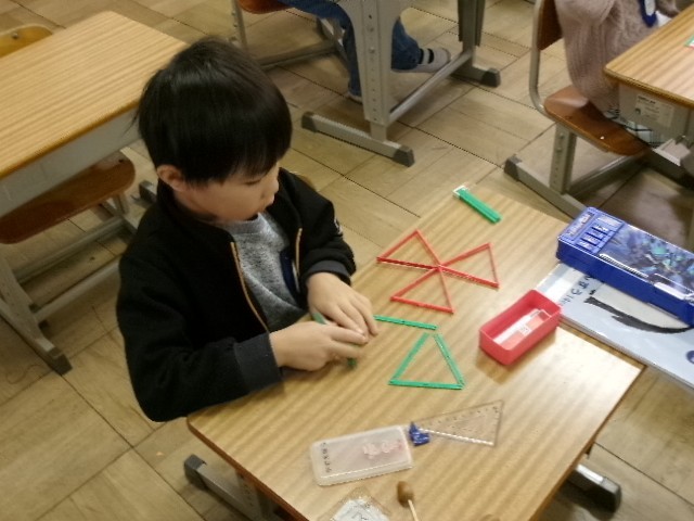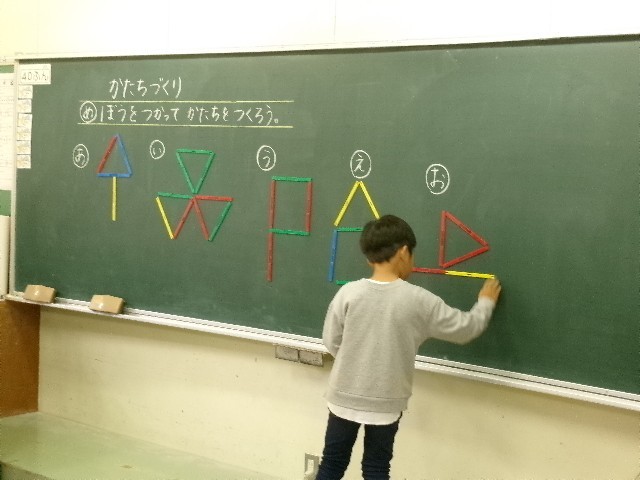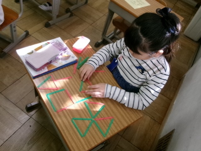 算数です。「かたちづくり」の学習です。数え棒を使って、いろいろな形をつくっています。図形の学習の基礎になります。
