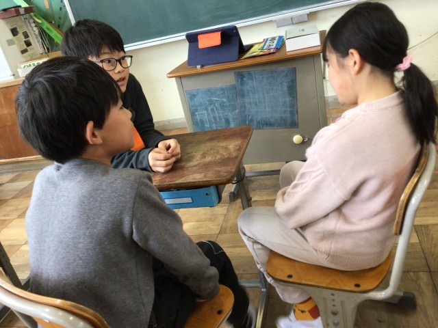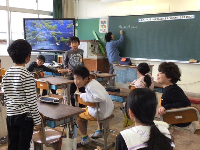 朝ごはんを食べるとどんないいことがあるのか話し合っていました。その後、栄養教諭の先生と栄養のバランスを考えた朝ごはんについて考えました。