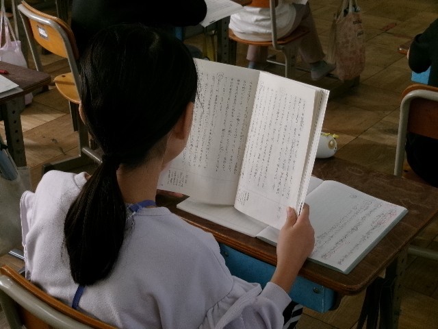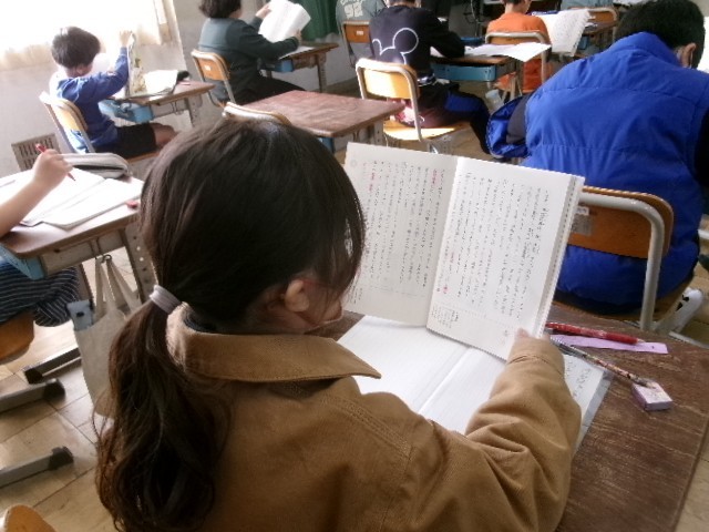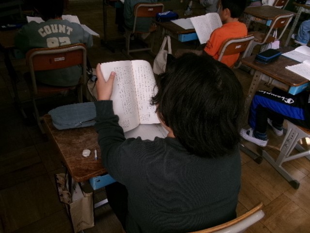 国語です。「中心となる語や文を見つけて要約し、調べたことを書こう(未来につなぐ工芸品)」の学習です。文章を短くまとめる要約の技術を身に付けます。みんなで音読して文章の内容を確かめています。