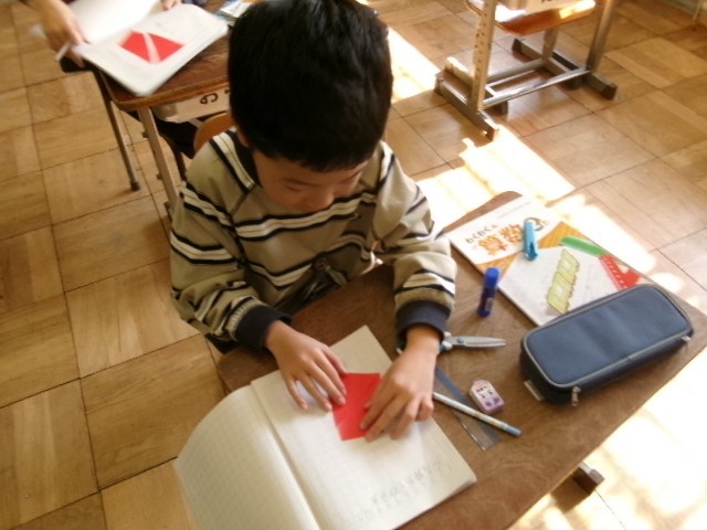 算数です。「三角形と 四角形」の学習です。色紙で作った四角形を、①2つ三角形、②2つの四角形、③三角形と四角形に切っています。このような作業を通して三角形と四角形の特徴を見つけます。