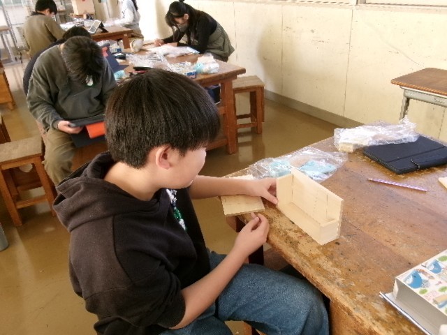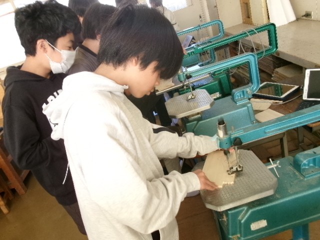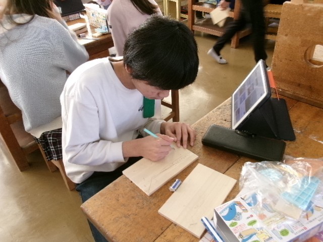 図工です。「1枚の板から」の製作です。テープカッターの製作が始まりました。設計図を描き、できた子から電動糸のこぎりで、設計図通りに板を切っていきます。