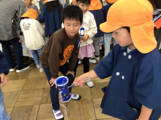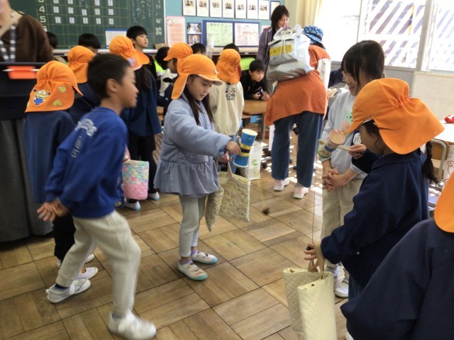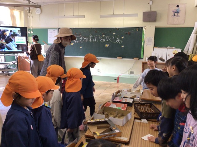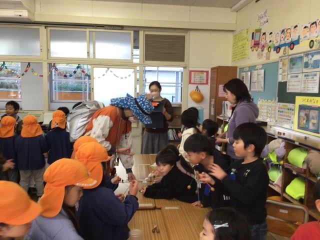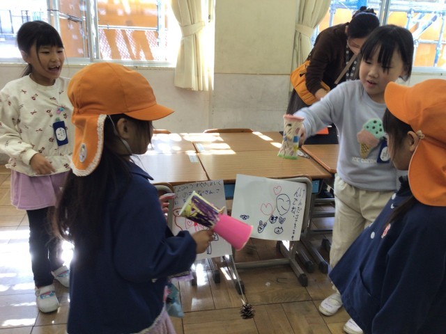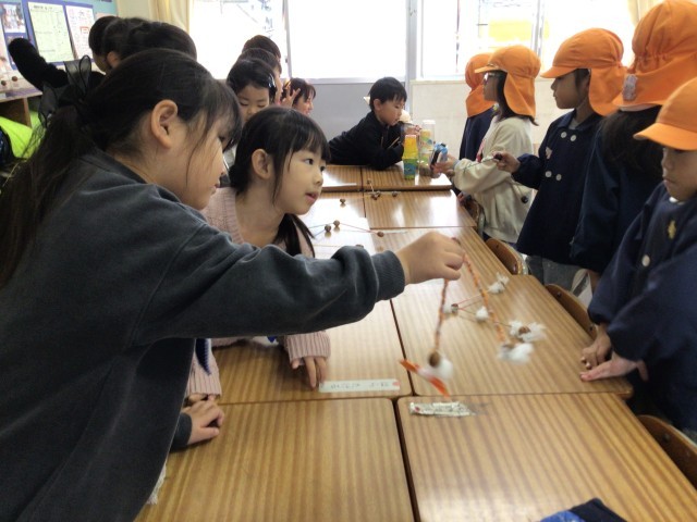 南粕谷保育園で来年1年生になる園児さんと1年生で交流しました。1年生は、秋みつけで拾ってきたどんぐりや松ぼっくりなどを使ったおもちゃを使って一緒に遊びました。最後に「またね」とお互いに声をかけあっていました。入学が楽しみですね。