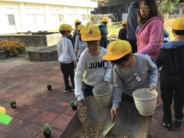 一人ひとりがパンジーのお世話を始めました。心を込めて育てて卒業式や入学式の式場を飾る予定です。今日は、鉢に土を入れて、ポットの花を入れました。毎日のお世話が楽しみですね。