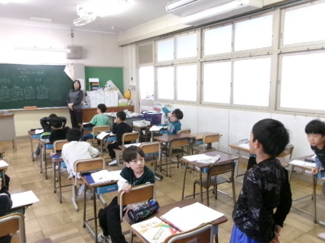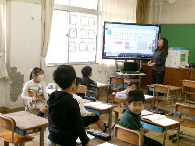 算数です。「どんな 計算に なるのかな」の学習です。文章問題を読んで、足し算・引き算なのか、かけ算なのかを考えて計算します。これまでの学習の復習も兼ねています。