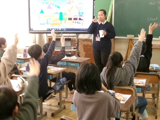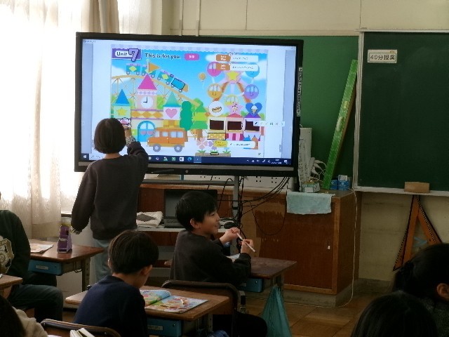 外国語活動です。「This is for you.」の学習です。「Rectangle(長方形)」「Square(正方形)」「Triangle(三角形)」など、形を表す英語を聞きとって、図の中からその形を探しています。