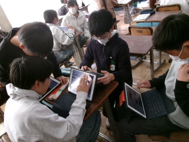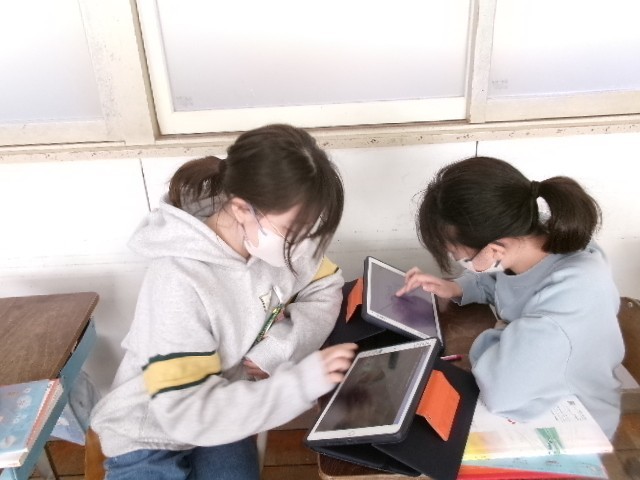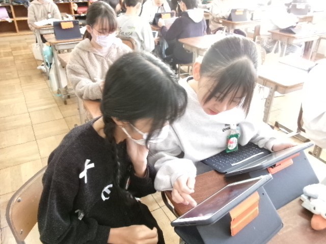 国語です。「相手や目的を明確にして、すいせんする文章を書こう(おすすめパンフレットを作ろう)」の学習です。自分の興味あることを伝えるパンフレットづくりをしています。タブレット端末が大活躍です。