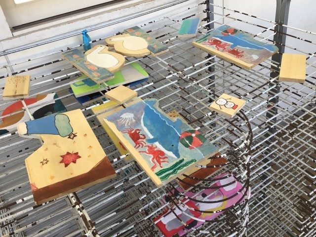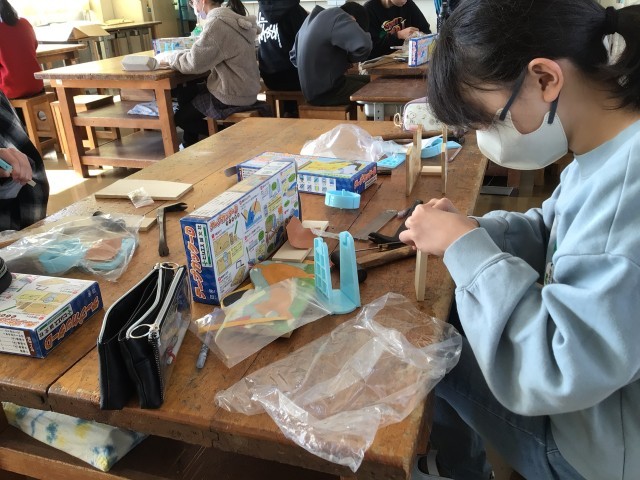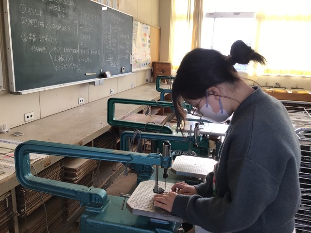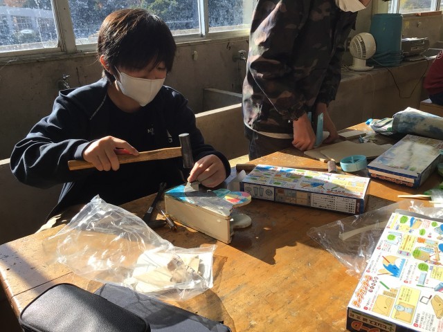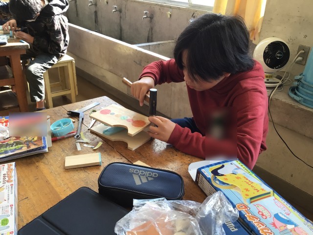 テープカッターを製作しています。電動鋸で板を形作ったり、くぎを打ったりしていました。色付けし、ニスを塗って仕上げています。