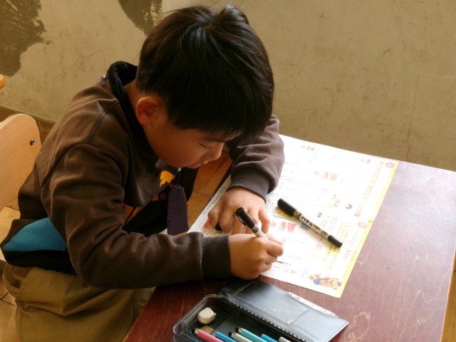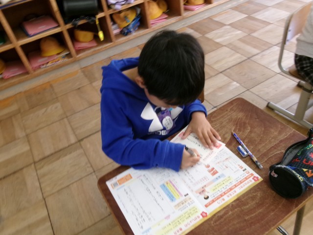 書写です。「年がじょうと書きぞめ」の学習です。今日は「年賀状」の書き方を学んでいます。住所の書き方や挨拶文などを、実際の年賀はがきに書いて実践しました。