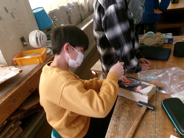 図工です。「1まいの板から」の製作です。テープカッターの製作が最終段階です。それぞれの思いのこもったテープカッターが次々と完成していきます。