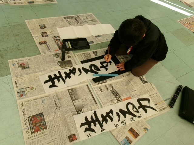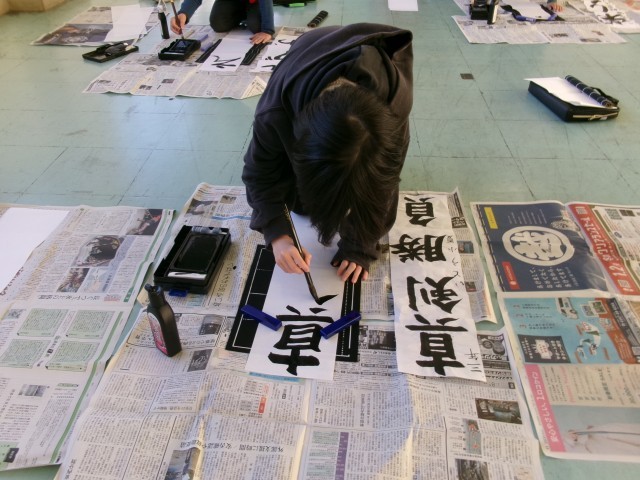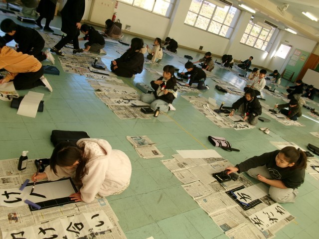 昨日に引き続き、3年生が書き初め会を開きました。3年生から始まった毛筆での初めての書き初めです。これまでの練習の成果が現れている力強い字で作品が仕上がっていきます。