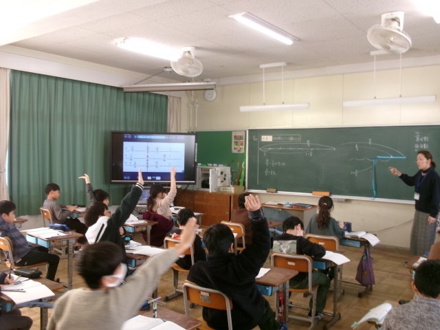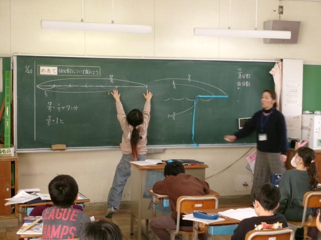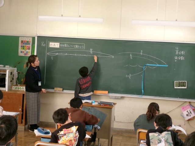 算数です。「分数」の学習です。分母より分子の方が大きい「仮分数」を学んでいます。5分の7を、1と比べたときの大きさをみんなで考えを出し合っています。