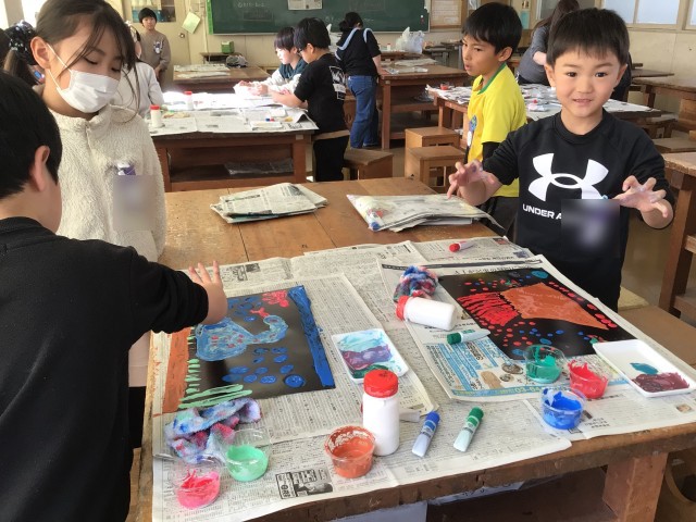 液体粘土と絵の具を混ぜて指で模様を描いています。それぞれ好きな形に描いていました。海や山、花を表現していました。できた作品を嬉しそうに見ていました。