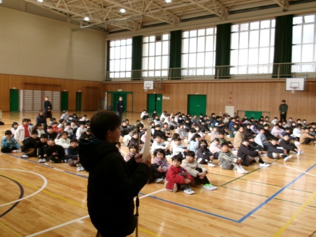 6時間目に、全校集会を行いました。寒い中ですが、元気な挨拶で始めることができました。知多市造形展の優秀作品表彰を行った後、保健委員会が、「手洗い・消毒、換気、生活リズム」のお話、放送委員会が「6年生へのお祝いメッセージ」の呼びかけを行ってくれました。