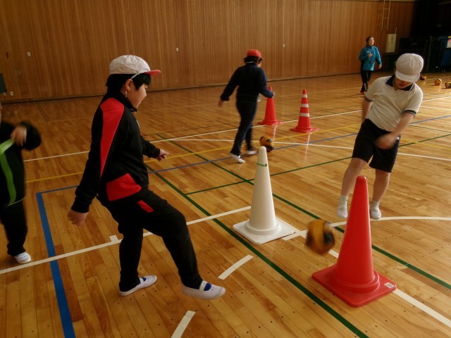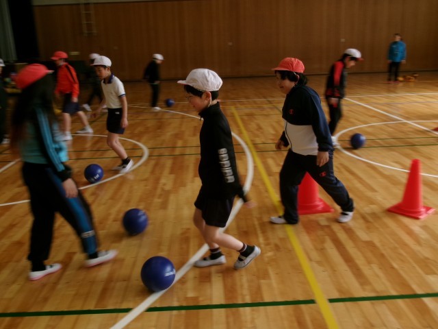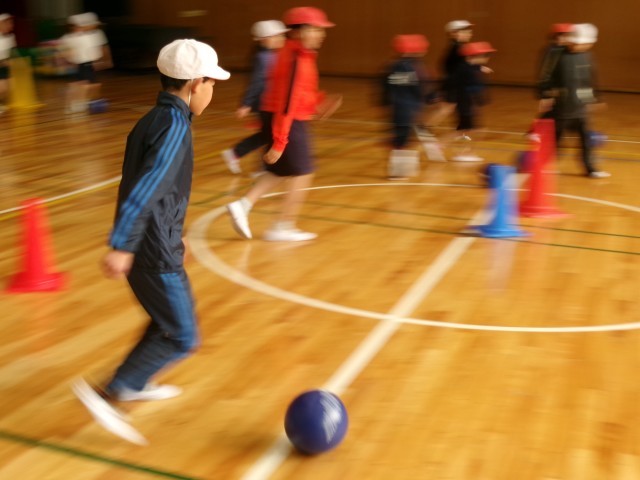 体育です。「ゴール型ゲーム( サッカ ー)」の学習です。新聞紙を利用した手作りボールやスポンジのように柔らかいボールを使って、ボールを蹴ったり、ドリブルしたりする感覚を身に付けます。
