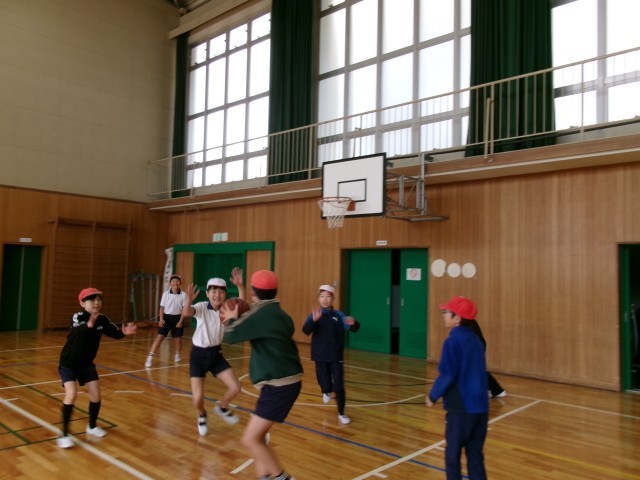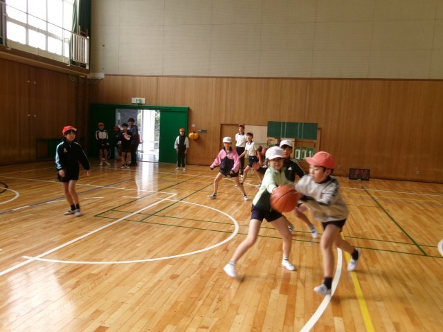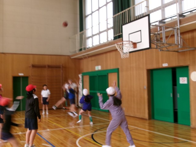 体育です。「ボール運動(ゴール型)バスケットボール」の学習です。コートの半面を使って、ミニゲームをして、ルールや動き方を確認しています。さすが5年生見応えのあるプレーです。