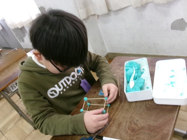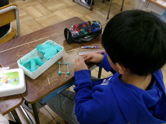算数です。「はこの 形」の学習です。はこの形を作るとき、何cmの辺が何本いるのかを、調べています。粘土と竹ひごを使って、実際にはこの形を作って確かめています。
