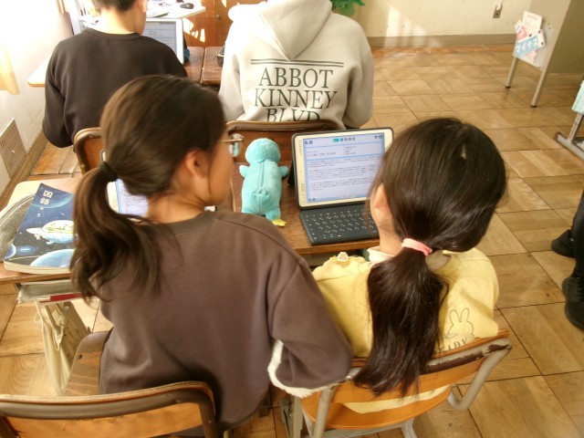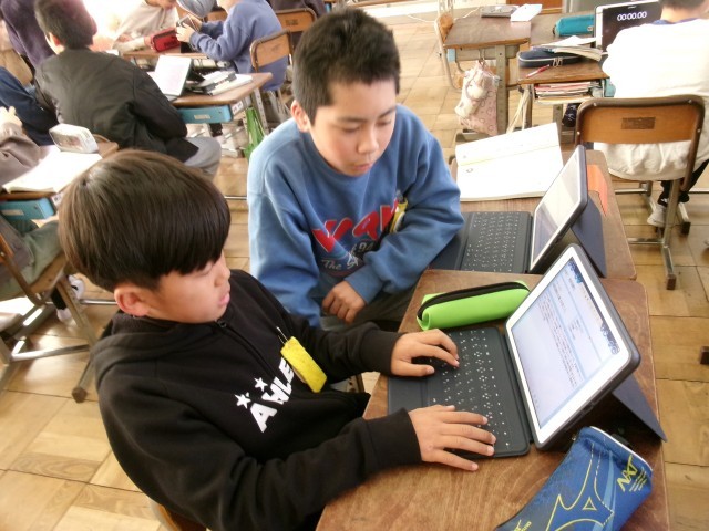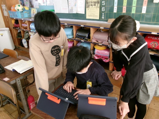 国語です。「事実と感想、意見とを区別して、説得力のある提案をしよう(「子ども未来科」で何をする)」の学習です。提案文を作っています。友達とお互いの文章を推敲しながらよりよい物を作り上げています。