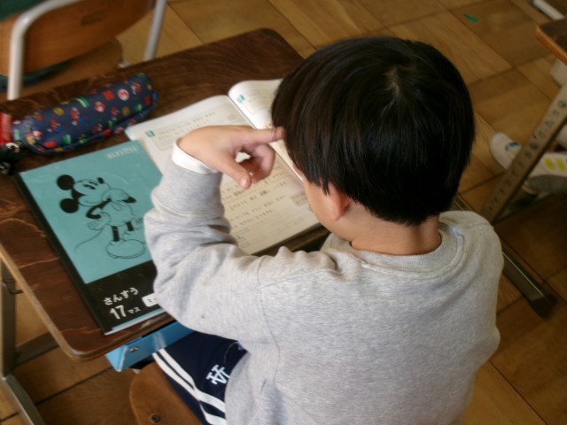 算数です。「分数」の学習です。いよいよ分数の学習が始まりました。まずは折り紙を半分に折ったり、チョコレートを半分に分けたりすることを数字に表していきます。