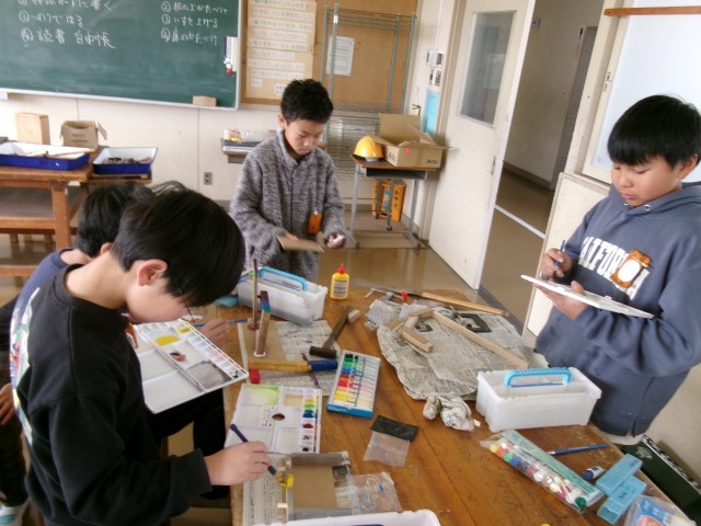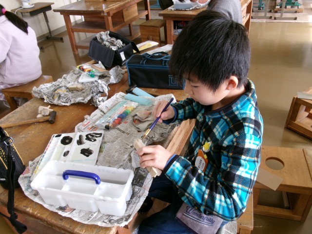 図工です。「のこぎりギコギコ」の製作です。のこぎりを使ってできた木片を組み合わせて形を作ります。今日は色を塗る作業です。もうすぐ完成です。