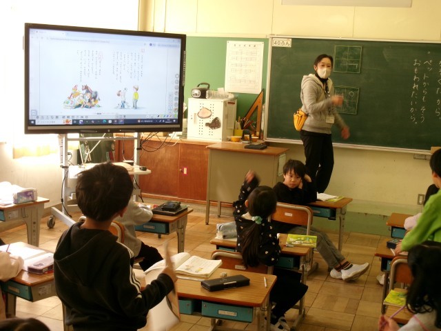 国語です。「よんで かんじたことを はなそう(ずうっと、ずっと、大すきだよ)」の学習です。最後の場面の主人公の気持ちを考えています。主人公になりきってどんなことを思ったか一生懸命考えています。