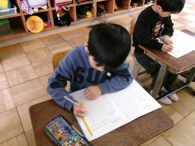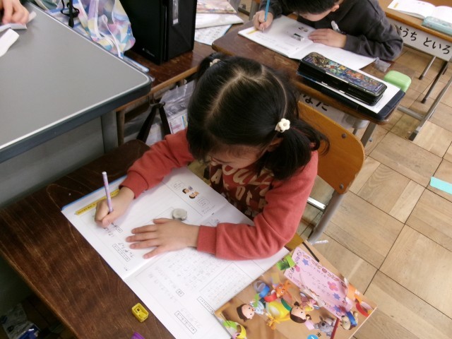 書写です。「文字の形」の学習です。文字の形を見て、「縦の長方形」「横の長方形」「正方形」「菱形」など、文字の形の違いに気をつけて書くことがめあてです。