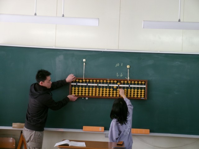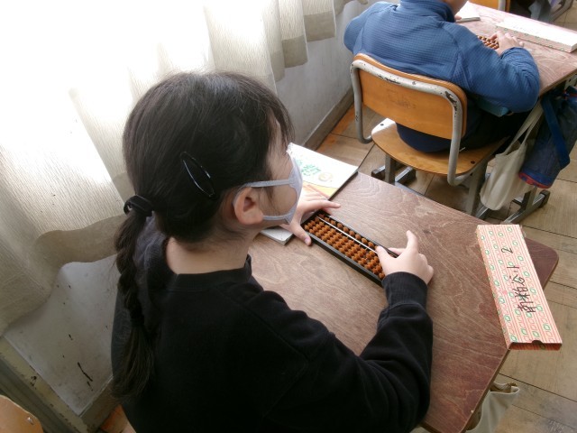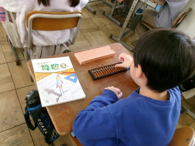 算数です。「そろばん」の学習です。一珠で1の値、五珠で5の値を表し、珠を数字に合わせて動かすことで四則計算ができる道具ですね。使いこなせるようになるようにがんばっています。