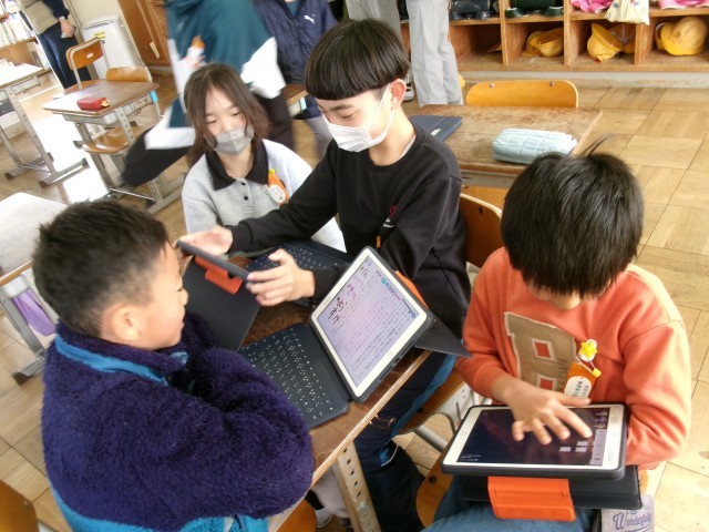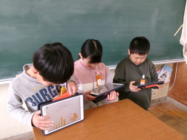 国語です。「調べて分かったことを話そう(調べて話そう、生活調査隊)」の学習です。自分で調べたことをクラフや表などを使って表し、わかったことを伝え合います。グループで発表に備えて練習しています。
