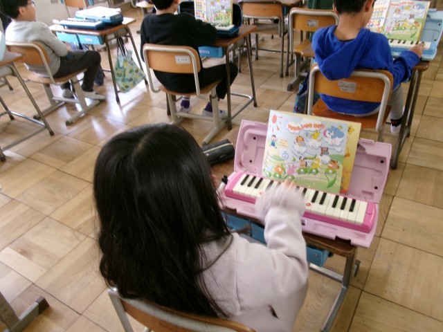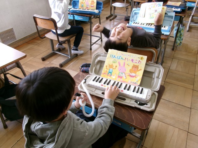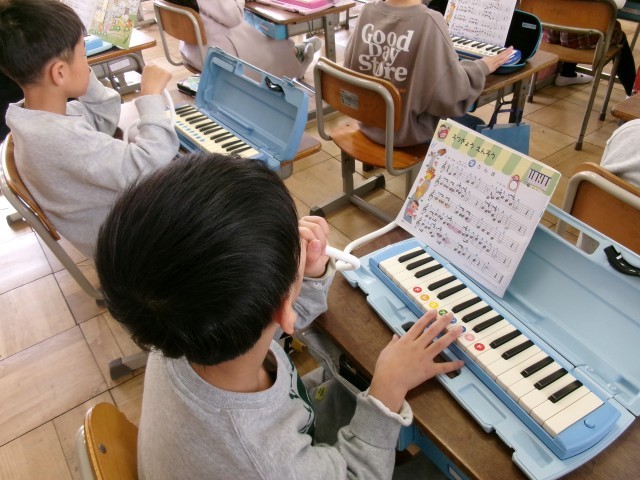 音楽です。「音楽ランド」の学習です。これまでの音楽の学習のまとめをしています。鍵盤ハーモニカで「さんぽ」が演奏できるように練習しています。鍵盤ハーモニカの扱いにもずいぶん慣れましたね。