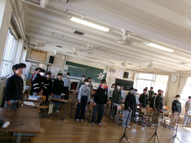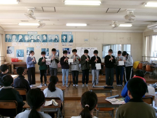 音楽です。学年末音楽祭と題して、これまで授業で練習してきたリーコーダーをグループで発表したり、全員合唱をしたりしました。6年間最後の音楽の授業をしっかり味わうことができました。