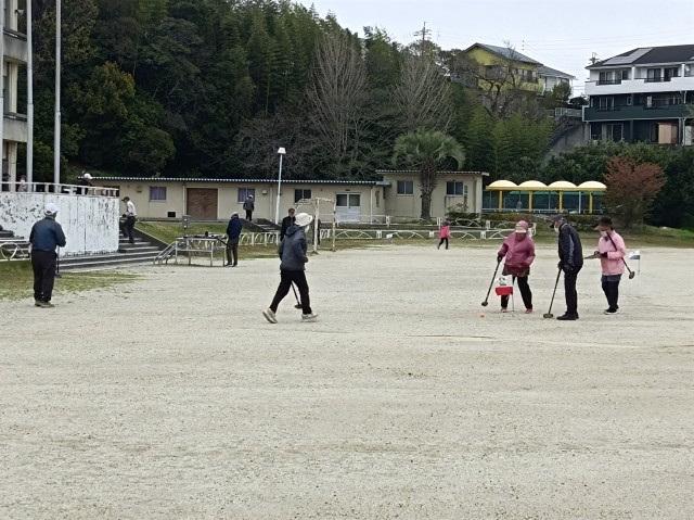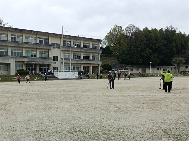 朝、地域の方々が運動場でゲートボールをされていました。たくさんの方々が、元気で楽しく活動されていました。目標をめがけて、ボールを打っている姿は、皆さん生き生きとしており、プロ並み(!?)の方々ばかりです。