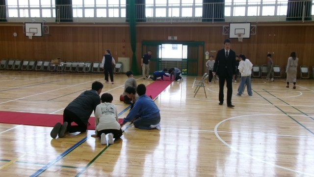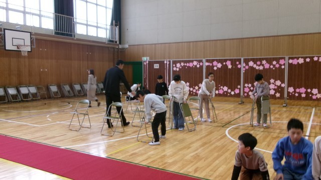 昇降口やトイレなどを掃除し、1年生の教室や体育館などの椅子を並べたり、飾り付けをしたりしました。