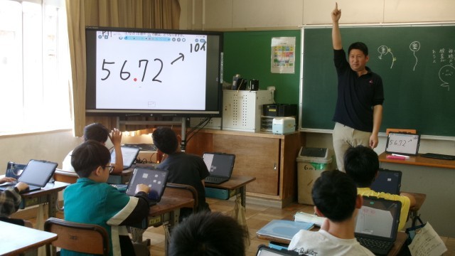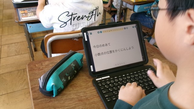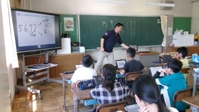 5年生の算数では、「小数点の位置を確認しよう」というめあてで、「56.72」を10倍したり、10分の1にしたりすると、「.(小数点)」の位置はどう動くか考えていました。