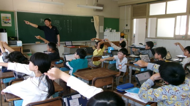 先生が、「10倍したら、小数点は右に動くか、左に動くかどっち?」の質問をし、児童らは腕を右にしたり、左にしたりして自分の考えを腕で表していました。