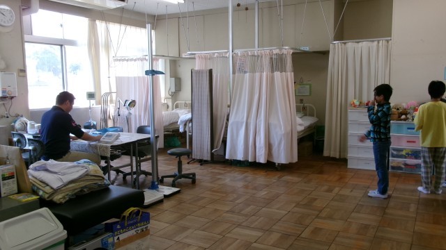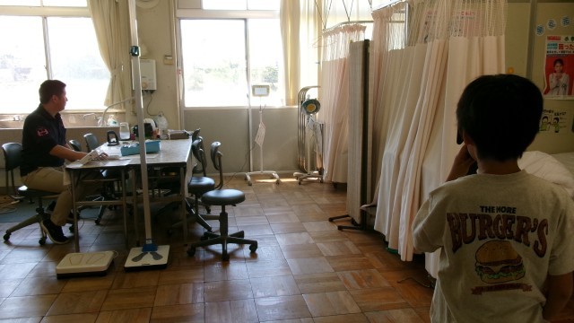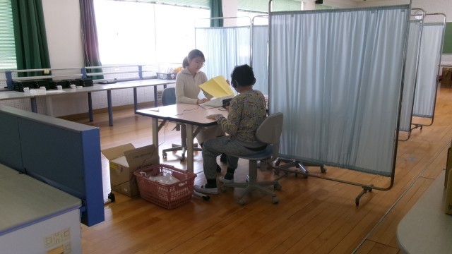 ミーティングルームでは、聴力検査をしていました。児童は耳に検査器具をつけ、保健の先生が音を鳴らして聞こえるか検査をしていました。