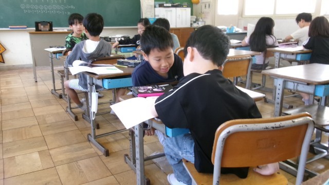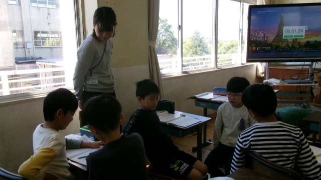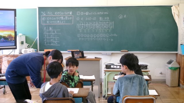 課題として「3点を10回とると何点か」を考えていました。自分の考えを近くの子に伝え合ったり、一緒になって相談したり‥。