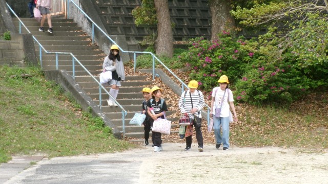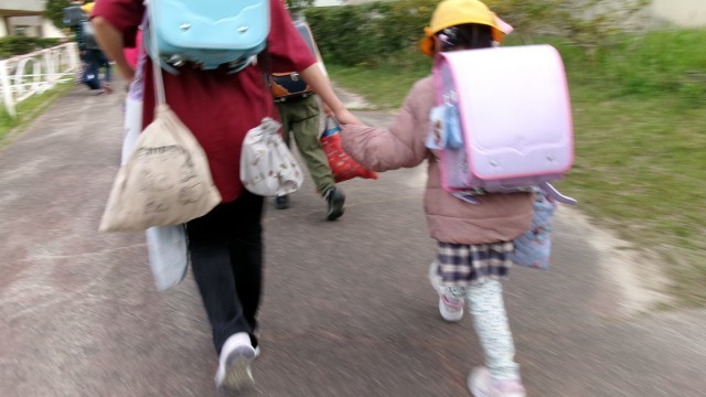 高学年の子が、低学年の子の手をつないで登校していました。