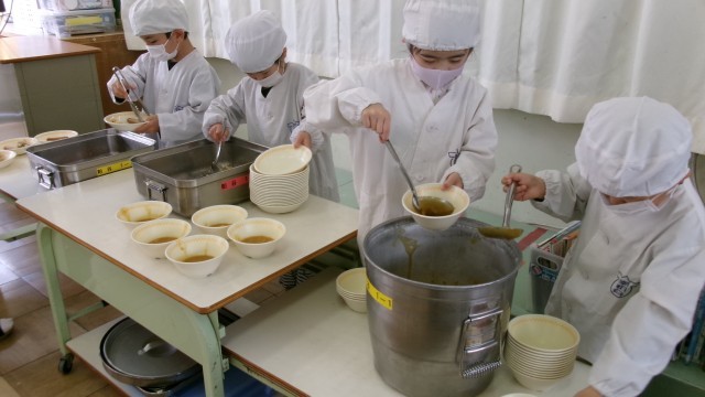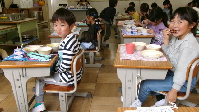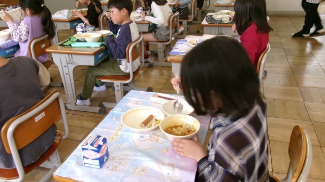 いただきますのあいさつをし、みんな笑顔で、給食を食べていました。